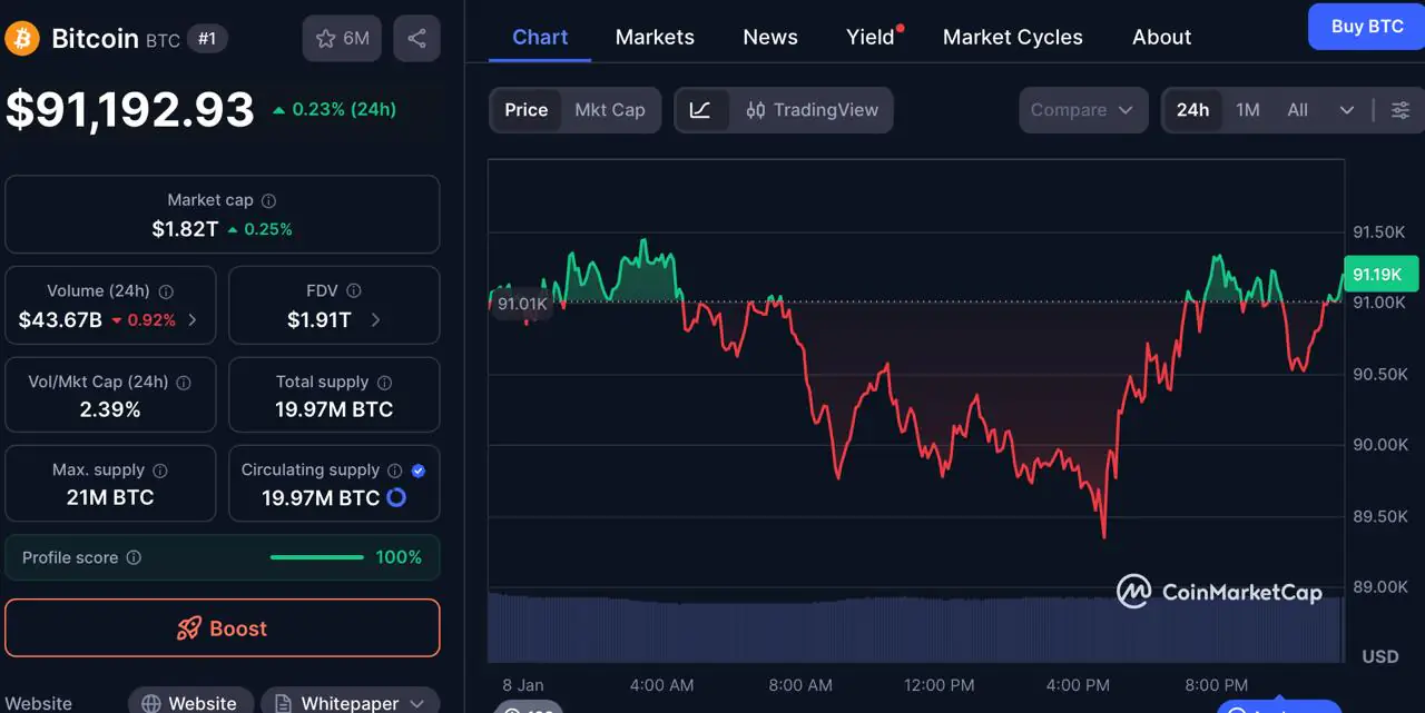 BTC价格接近 92,000 USD这来自于多种原因的一同用途。据 CoinMarketCap 数据显示,机构投资者对BTC的同意度正处于高速增长期。现货BTC ETF 在 2025 年末和 2026 年初积累了很多资金流入。贝莱德和富达的商品也持续遭到平时购买。这类并不是投机性的散户资金流动,而是经典的金融系统性投资。