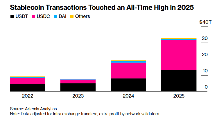 2025年,稳定币买卖量同比增长72%,达到创纪录的33万亿USD。美元C以18.3万亿USD的买卖量领跑,超越美元T的13.3万亿USD,成为买卖量最大的稳定币。