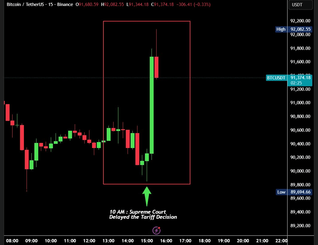 宏观层面,市场仍处于紧张状况,主要受两个原因影响。第一,最高法院推迟了关税裁决,致使USD飞速上涨2100USD。BTC [比特币]公告发布后仅45分钟内。