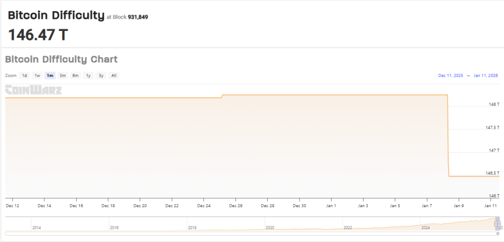 BTC挖矿困难程度在2026年初次互联网困难程度调整中降至略高于146万亿,为矿工带来了小幅但可衡量的缓解。据多家媒体报道,此次调整于1月初完成,使该指标较2025年底的水平有所降低。