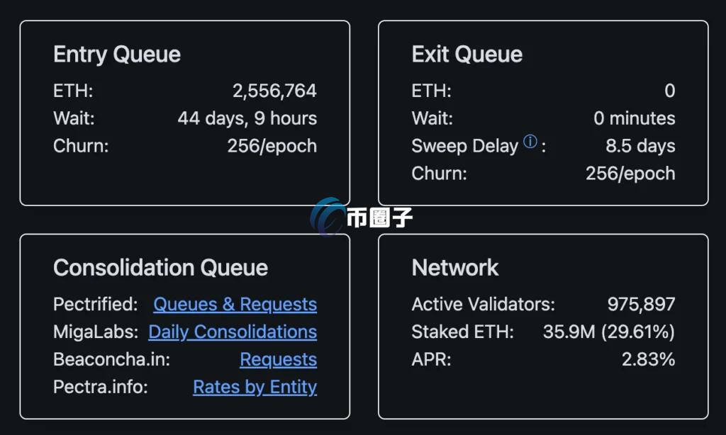 币圈子讯:依据Validatorqueue链上数据显示,ETH目前质押总量已升至3,590万枚,质押率正向30%大关迈进。目前质押队列等待时间拉长至约44天,排队中的以太币超越255万枚;退出的数目则挂零,显示锁仓意愿强劲。
