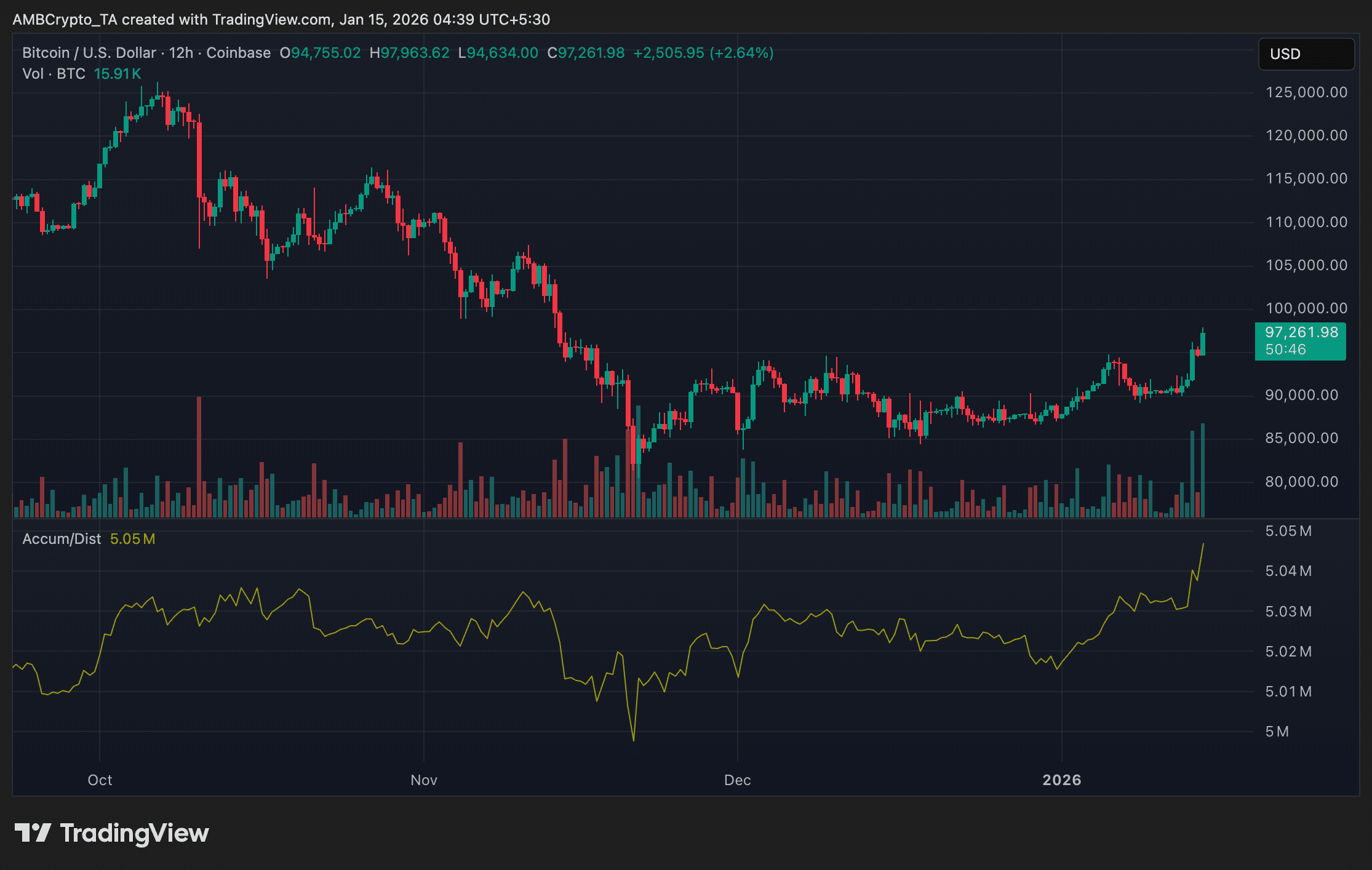 截至发稿时,依据 TradingView 的数据,BTC买卖价格约为 97,200 USD。这标志着BTC价格果断突破了自 2025 年末以来持续数周的盘整区间上轨。