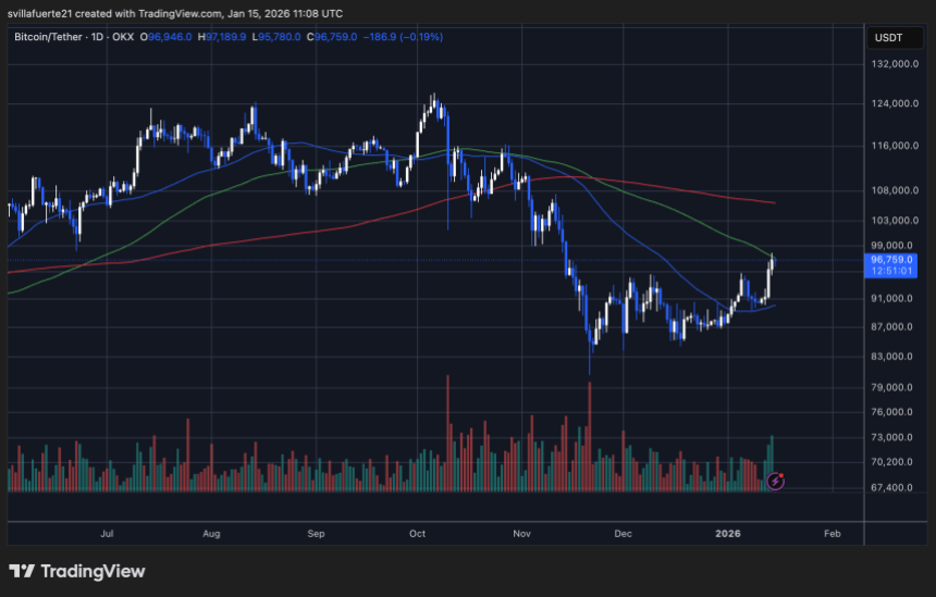 BTC价格在12月低点大幅反弹后正试图企稳,图表显示比特币已重回96,000USD至97,000USD区间。这一价格与多种技术原因的汇合点相吻合,使其成为短期走势的重点地区。最近的反弹是在11月高点之后的一次强劲抛售之后出现的。当时,价格跌破了50日和100日移动平均线,并短暂跌至80,000USD出头。