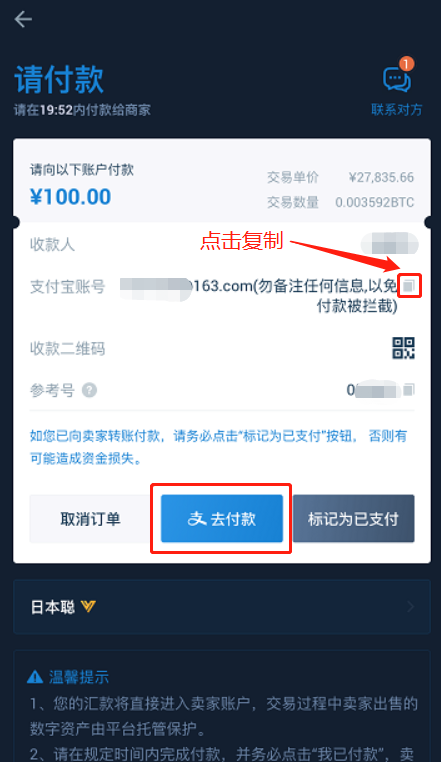 第三步:进入付款界面,复制收款人信息,用支付宝转账。完成付款后返回,点击“标记为已支付”,状况变为“待放行”。