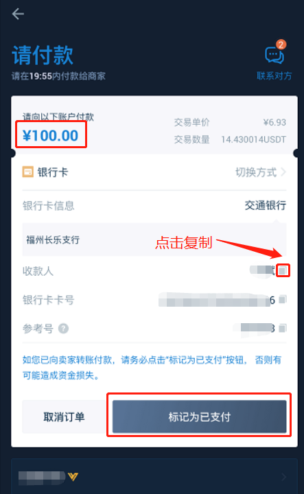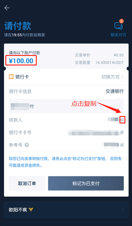第三步,复制收款人信息,用银行卡转账。完成付款后返回,点击“标记为已支付”,状况变为“待放行”。