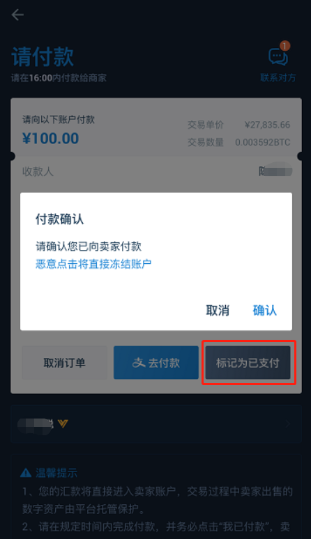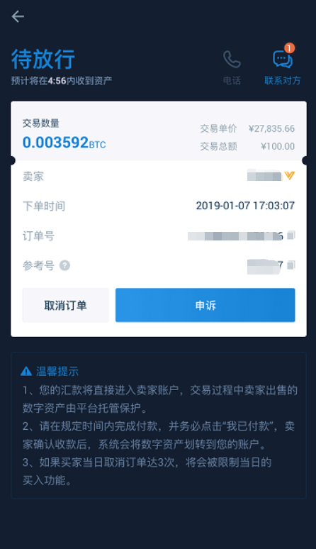 第四步:卖家放币,完成买卖。