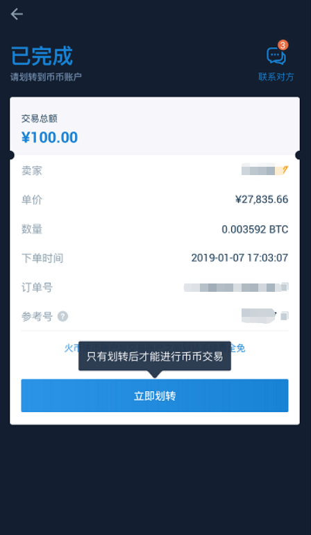 第四步:卖家放币,完成买卖。你可以点击“划转到币币账户”,将数字资产划转至币币买卖账户。